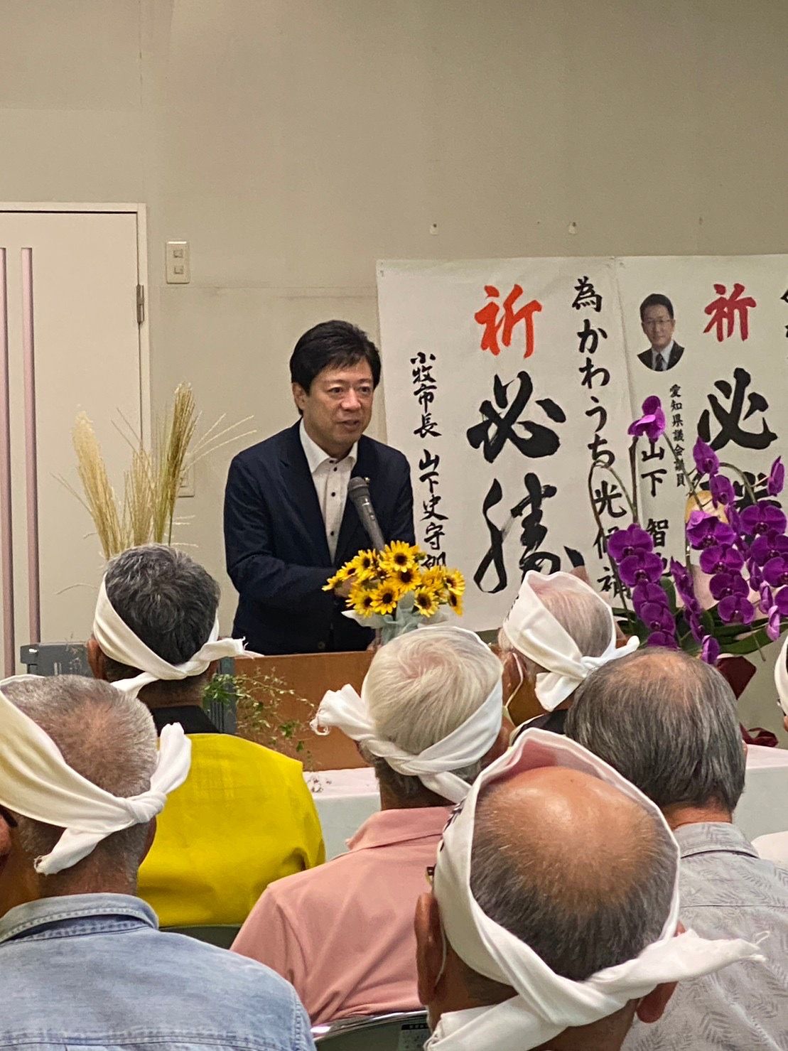 朝よりつじ立、今日は今回選挙で幹事長をして頂いている三ツ渕のお兄さん、しげきさんと二人で、最後のつじ立をしげきさんとできて良かったです。物静かな方ですが二人でいると優しさをいつも感じます^^。その後、前回選挙でお会いし、励ましのお言葉を頂いた大手企業副社長様がお忙しい中ご来所され今回もありがたいお言葉を頂きました。その後いつものごとく歩いて選挙活動、後援会の皆様が足の事を心配してくれてお昼からは事務所で休養、外に出なかったため、来所してくださるたくさんの方とお話が出来ました。夕方からは総決起集会を後援会事務所で開催し、丹羽秀樹衆議院議員様、山下史守朗小牧市長様、山下智也愛知県議会議員様、舩橋貴康区長様、熊澤正幸区長様、谷田憲昭会長、後援会幹部の皆様から激励の言葉をたくさん頂戴いたしました。私は、最強の後援会、最強の地域の皆様と一緒に目標に向かって走り抜けたいとお話をさせて頂きました^^。